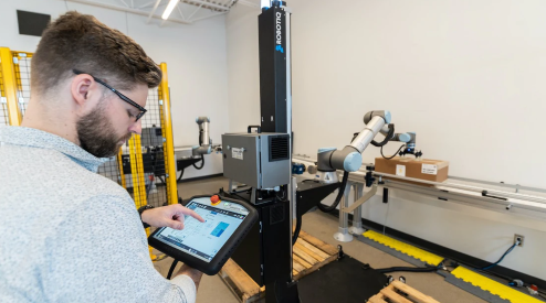 UR機器人公司和Robotiq合作出一個碼垛解決方案。客戶收到機器人之后,直接在UR機器人的示教器上操作,Robotiq夾爪直接進行工作。Copilot會根據托盤設計并優化所有機器人的行動軌跡,與生產線的吞吐量相匹配。UR機器人和Robotiq夾爪的合作進一步簡化了編程,即使是無經驗的人員也可以很快地操作UR機器人。