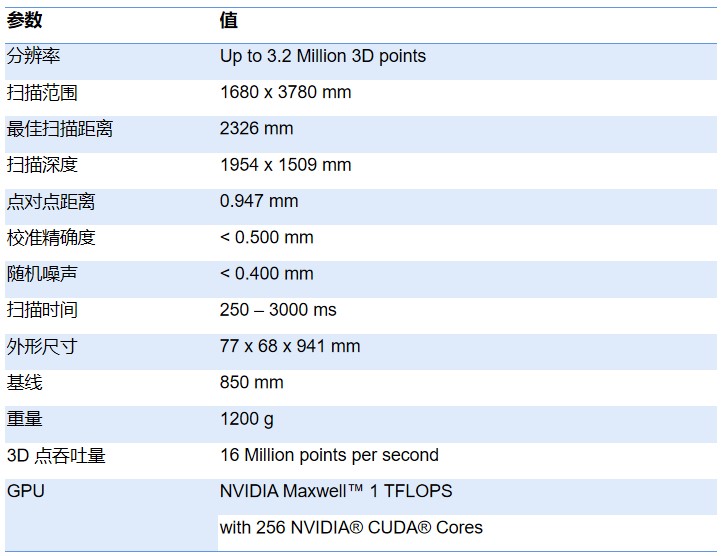 Photoneo PhoXi 3D Scanner XL參數如下: