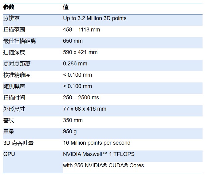 Photoneo PhoXi 3D Scanner M參數如下: