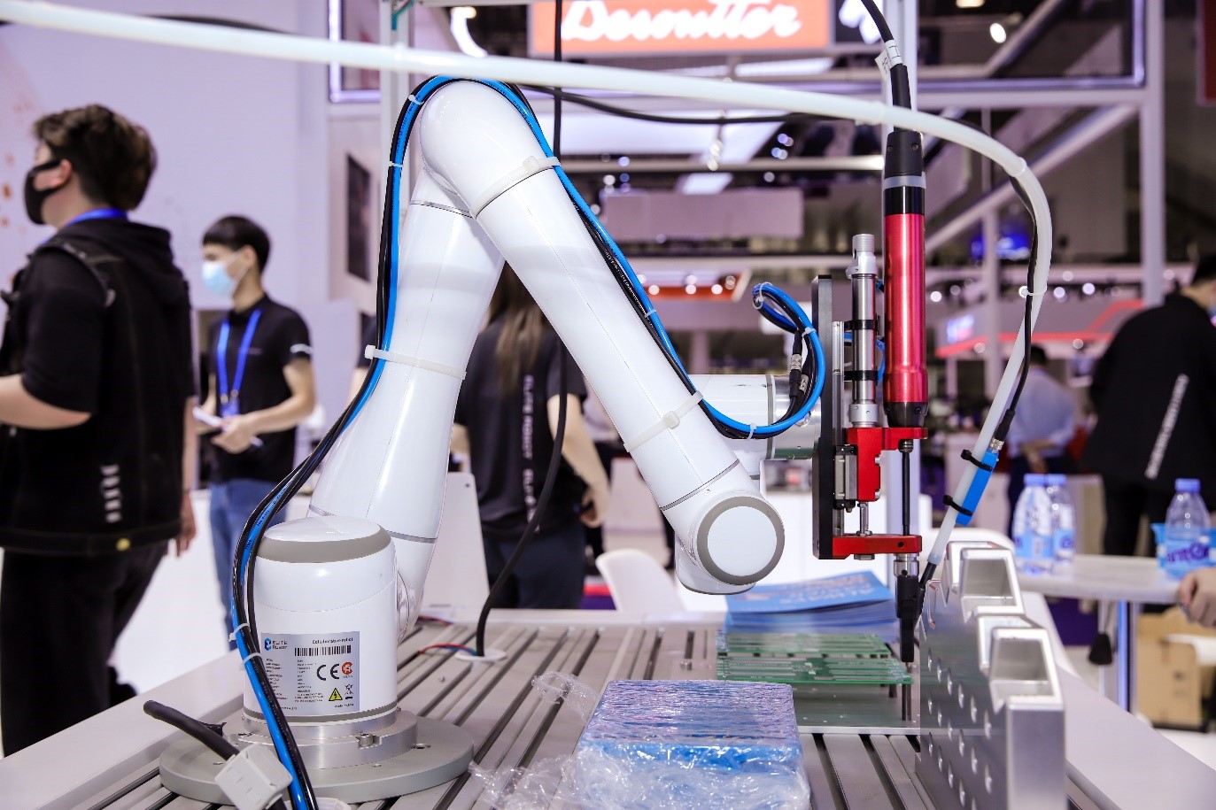 功能說明:艾利特EC612協作機器人與擰緊槍匹配,高效完成產品擰緊過程。該工站模擬展示發動機或變速箱組裝過程中的擰緊工藝,搭配艾利特協作機器人高定位精度和簡易編程的特性,使整個擰緊系統不僅高效,且針對不同型號產品的生產需求,可以做到迅速切換,高效且柔性。