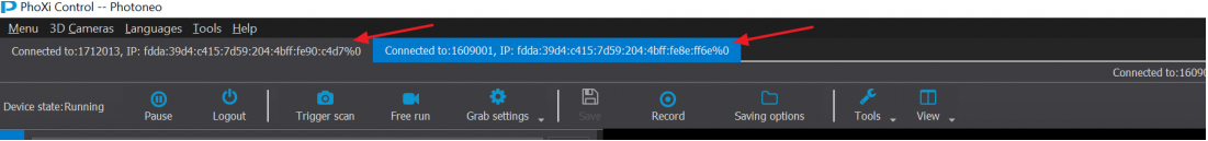 連接到第一臺掃描儀,然后單擊菜單->網(wǎng)絡(luò)發(fā)現(xiàn),然后單擊要連接的第二臺掃描儀。然后,您將有兩個(gè)選項(xiàng)卡,如下圖所示,然后您可以通過單擊它們在這兩個(gè)選項(xiàng)卡之間進(jìn)行更改。