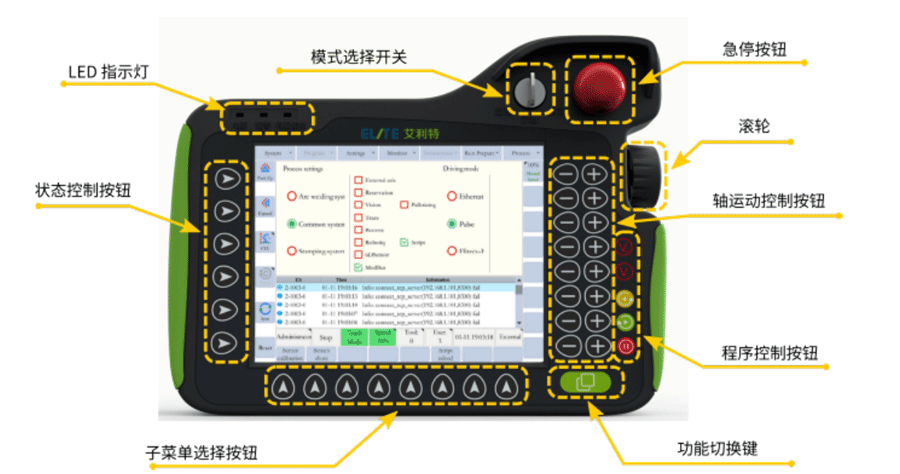 示教器是機器人進行編程的地方。用戶可以使用觸摸屏選擇選項,也可以使用觸摸屏周圍的 物理按鈕激活其他選項或功能。示教器的正面及其顯示屏和按鈕如圖1所示。