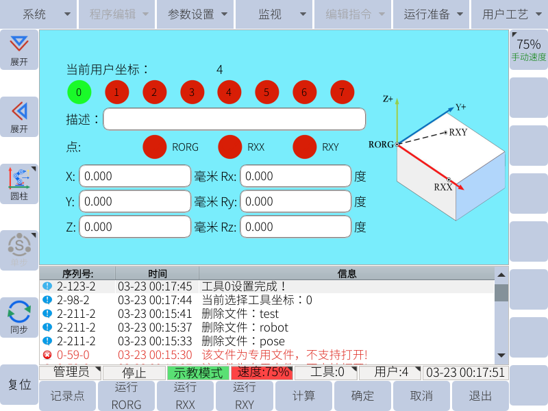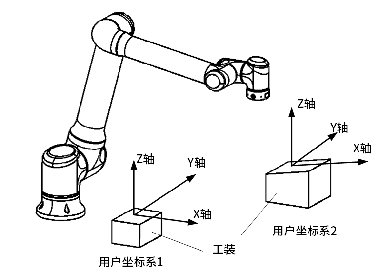 此外,艾利特協(xié)作機(jī)器人配有專用的可編程操作界面,用戶可通過此界面實(shí)時(shí)觀察機(jī)器人的運(yùn)行狀態(tài),對(duì)機(jī)器人進(jìn)行諸多控制設(shè)置,也可脫機(jī)進(jìn)行離線仿真,極大地提升了實(shí)際應(yīng)用的工作效率。建立艾利特機(jī)器人用戶坐標(biāo)系,可以方便示教編程時(shí)使用。如圖1所示,有幾個(gè)工裝面就需要設(shè)置幾個(gè)用戶坐標(biāo)系。
