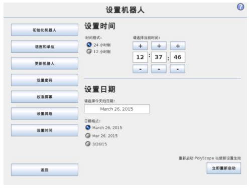設置系統的時間和日期,并配置時鐘的顯示格式。時鐘顯示在運行程序和機器人編程屏幕頂部。輕觸時鐘將立即顯示日期。必須重新啟動 GUI,所做更改方可生效。