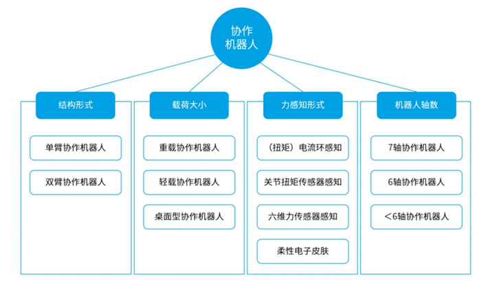 協(xié)作機(jī)器人主要由機(jī)器人本體、中空力矩電機(jī)、諧波減速機(jī)、伺服驅(qū)動器、控制器組成。按照結(jié)構(gòu)形式、載荷大小、力感知方式以及機(jī)器人軸數(shù)的不同,協(xié)作機(jī)器人可以分為十多種。