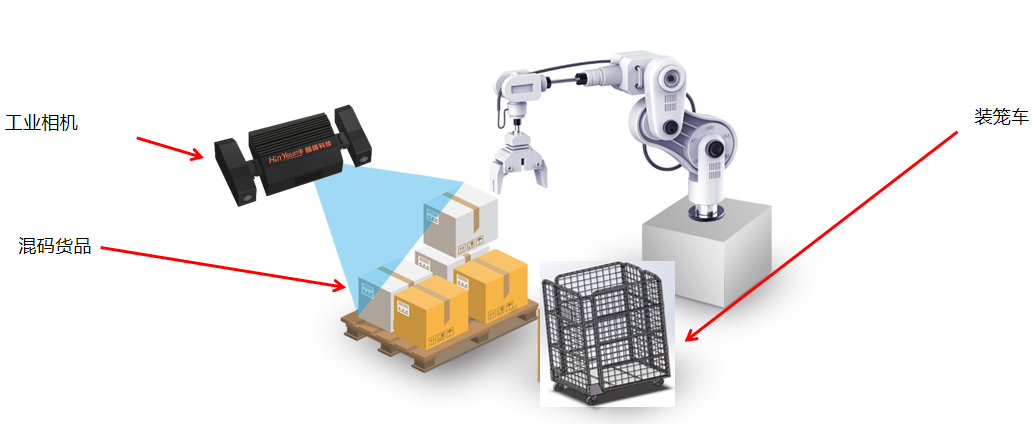 通過3D視覺系統(tǒng)引導(dǎo)機器人碼件,能夠?qū)崟r捕捉籠車位置、狀態(tài)和貨物信息,實現(xiàn)對籠車混碼情況的準(zhǔn)確識別和指導(dǎo),很大程度上降低了人力成本。