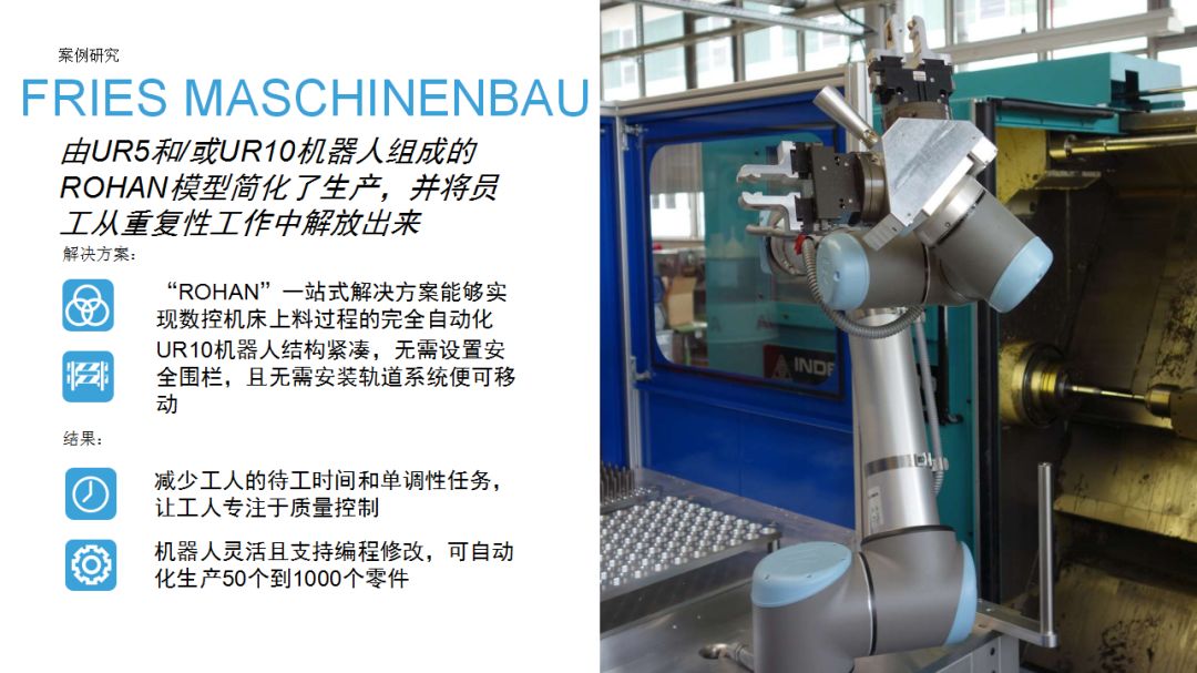 UR機器人為企業提供了一種思路:相比傳統工業機器人,協作機器人成本較低,占地空間小,導入現有工作流程時無需對產線進行復雜和昂貴的重新部署,項目集成周期短。優傲機器人始終堅信,協作機器人擁有巨大的潛力,能夠在廣泛的應用場景下協助人類工作。本期內容中,協作機器人用于金屬加工和機床上下料,希望這些案例能夠為有類似場景的用戶提供借鑒。