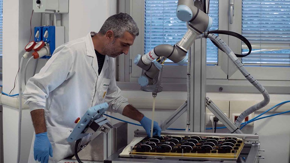 為了提高過程的生產率和效率并確保出色的可重復板質量,該公司選擇了機器人自動化,并使用優傲UR3機器人進行灌封操作。