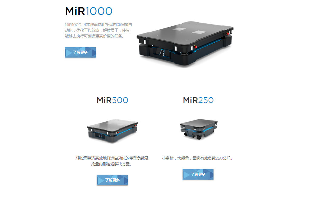 自成立以來,MiR堅持每年推出一款新機器人,竭力滿足客戶需求。現(xiàn)有AMR的有效負(fù)載從100公斤到1000公斤不等,可優(yōu)化從運送小零件到自動搬運重物和托盤的所有工作流程。