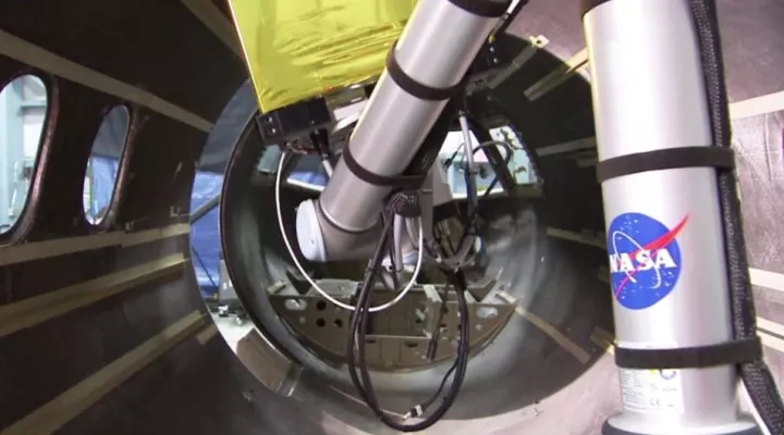 NASA配備了一臺(tái)協(xié)作式機(jī)器人,以及一個(gè)正在對(duì)機(jī)身內(nèi)部進(jìn)行檢查的紅外線檢測(cè)系統(tǒng)。協(xié)作式機(jī)器人與常規(guī)機(jī)器人略有不同,區(qū)別在于其具有內(nèi)置的各項(xiàng)安全性能,這樣就使得研究人員可以靠近檢測(cè)工具協(xié)同工作,在進(jìn)行檢查時(shí)無需再設(shè)置保護(hù)區(qū)域禁止人員進(jìn)入。這種人機(jī)協(xié)同作業(yè)帶來的改變是,NASA的工作人員可以在飛機(jī)上同時(shí)開展多項(xiàng)工作,無論是使用多個(gè)協(xié)作機(jī)器人,或者在進(jìn)行檢測(cè)時(shí)在飛機(jī)上進(jìn)行其他作業(yè)。