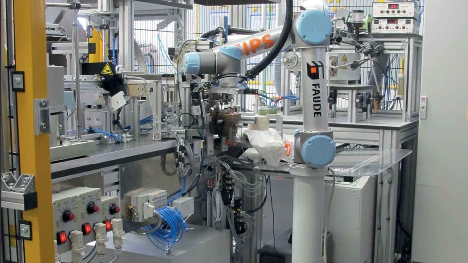 ? 現在,兩個UR機器人(彼此以及其他機器)緊密協作,可以控制復雜的焊接和焊接過程。第一個機器人選擇要焊接的零件,將其插入點焊機,然后將其放入流體中。第二個機器人將工件帶到高頻焊接站以融合在一起。然后,機器人將工件固定在攝像頭系統上,該攝像頭系統會自動客觀地檢查焊接和錫焊工作的質量。