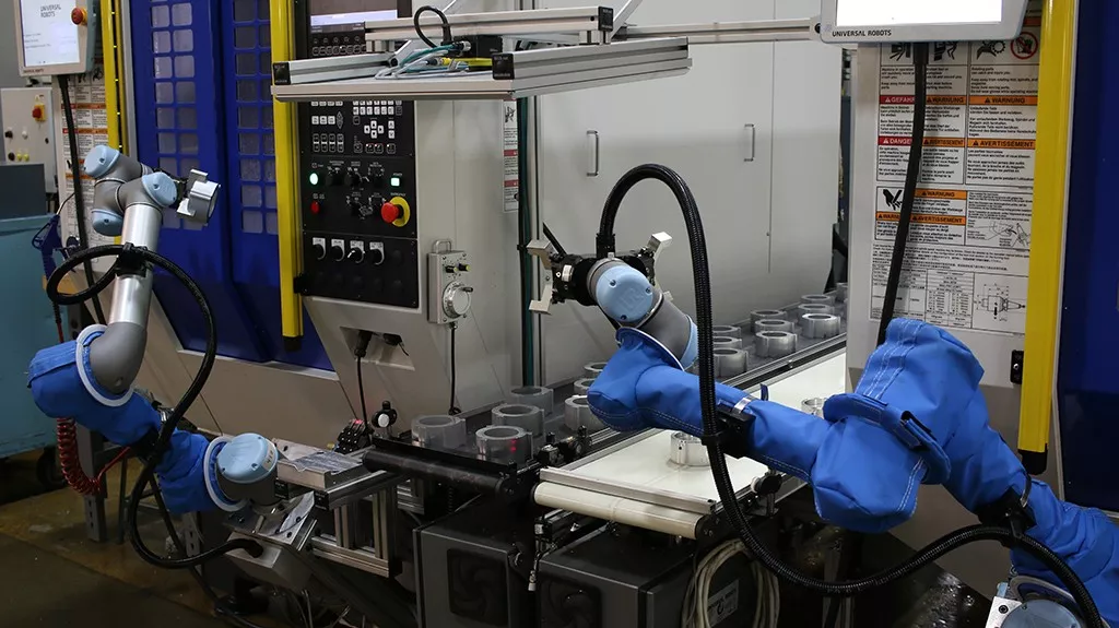 他們了解到協作機器人十分靈活,方便移動到不同的產線上。于是安裝了一臺UR10機器人和兩臺UR5機器人用來照管機床;第四臺UR5安裝在帶車輪的移動工作臺上,負責在各任務間靈活調度。