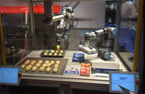 優傲機器人公司出品的人機協作機器人在食品加工環境中已證明具備用武之地。食品加工對其環境的溫濕度條件和衛生狀況有特定的要求。優傲機器人可以在環境溫度0°C到50°C之間、含氧量相對較低的環境下正常工作工作,而這對于人工來說則必須配備特殊的設備。