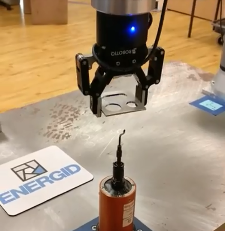 第一個演示中, ATI兼容去毛刺刀片(CDB) 固定在工作臺上。配備Robotiq 2F-85自適應夾具的UR10e機器人,將金屬部件呈現給ATI CDB,以去除內部特征。機器人相對于ATI CDB以恒定速度移動零件。
